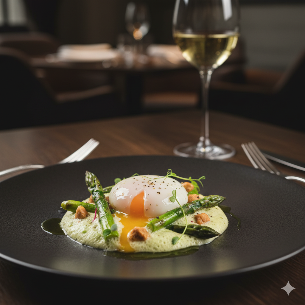 Crème de Parmesan, asperges vertes rôties, noisettes torréfiées.